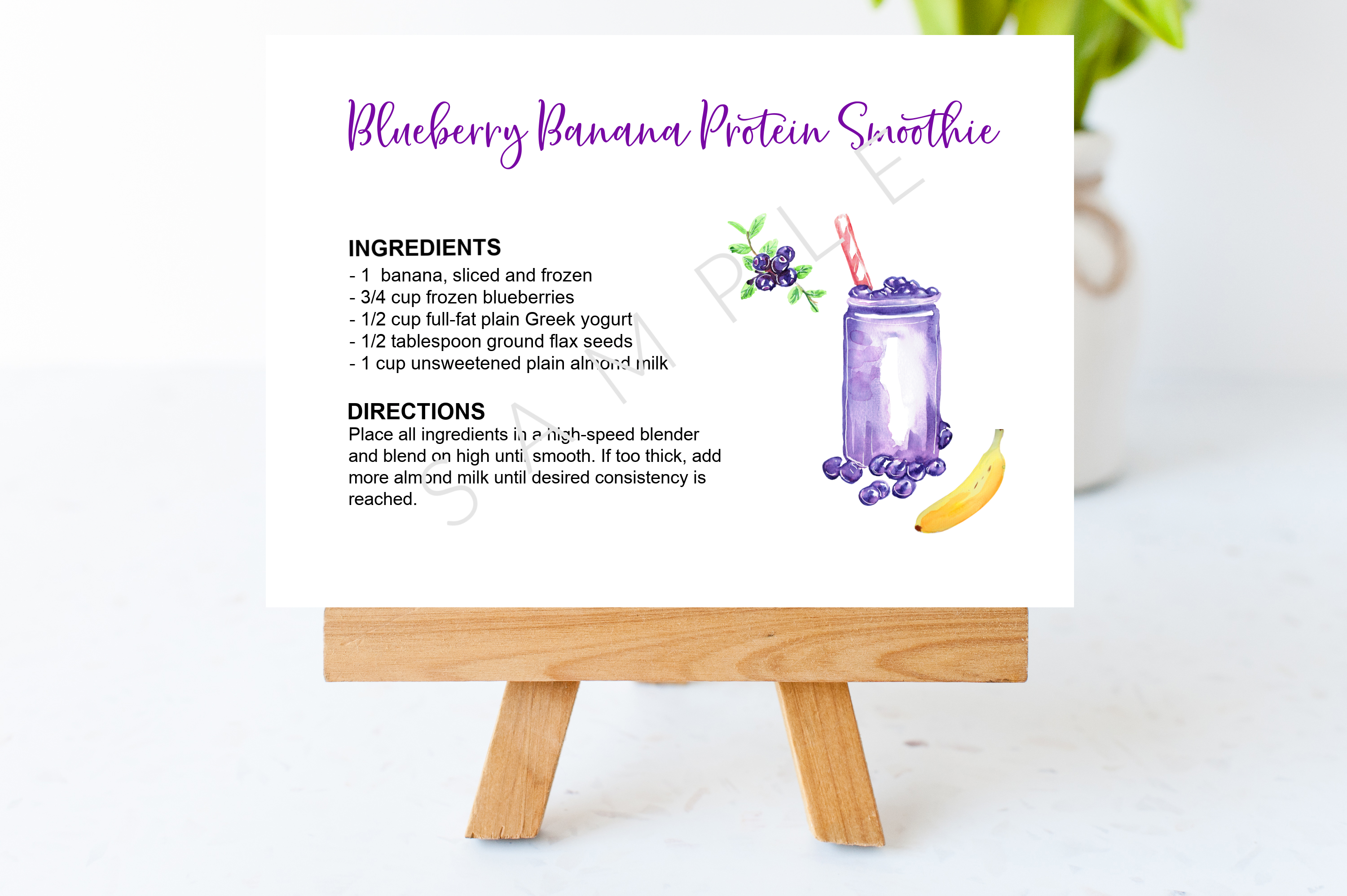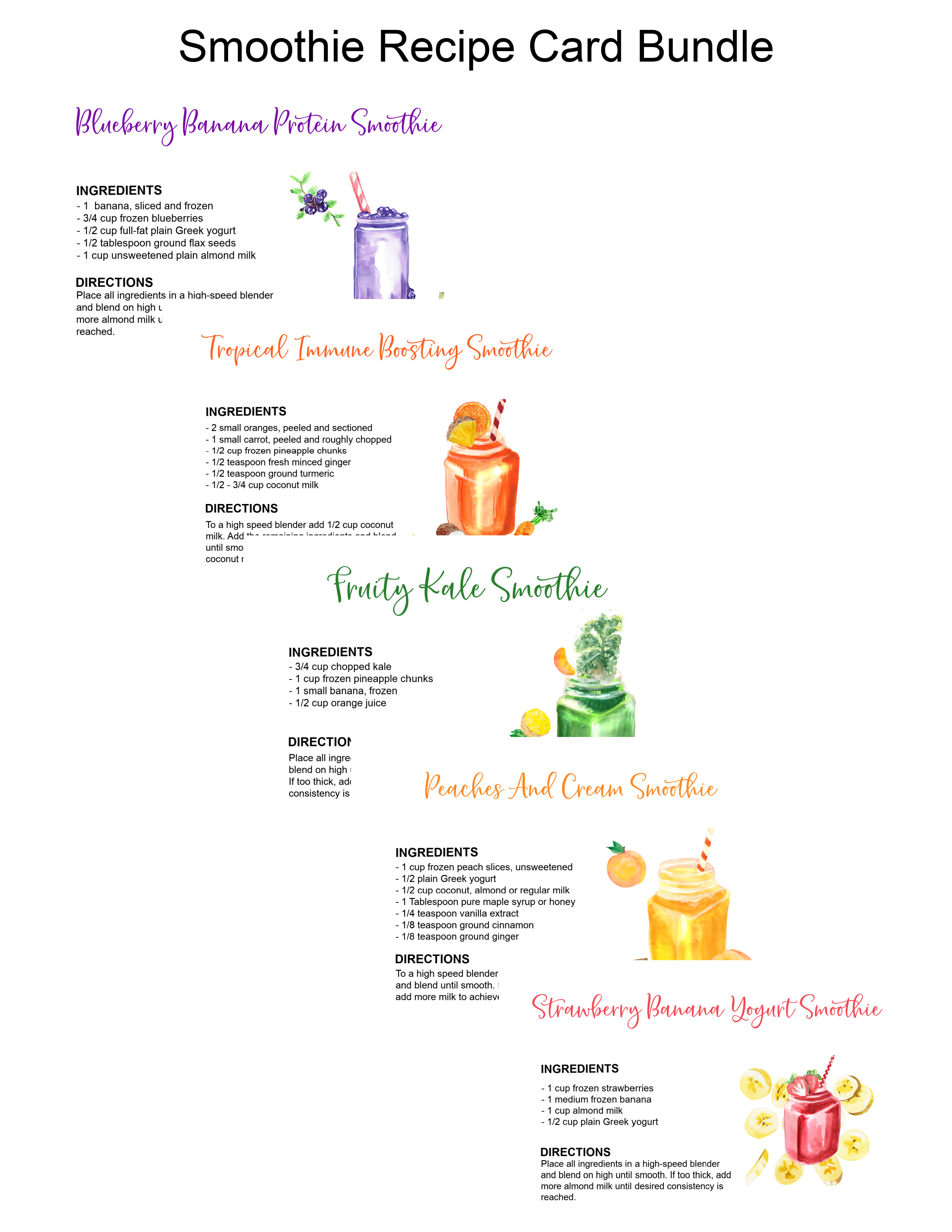 Beautiful and colorful fruit smoothie recipes are available as digital downloads, sized in 4 x 6, for easy printing on your end.